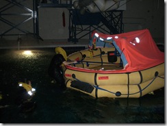 The last part was the cabin simulator. During these drills we are running through what we would do in the case of planned and unplanned water and land evacuations. I wasn’t able to take very many pictures because we were all busy at the same time. When one was the flight attendant the others were the passengers. These simulators are really cool because they move up and down and back and forth depending on the type of emergency. They also make noises and the lights flicker and everything. This is a picture of the flight attendant throwing the raft out of the emergency exit window: